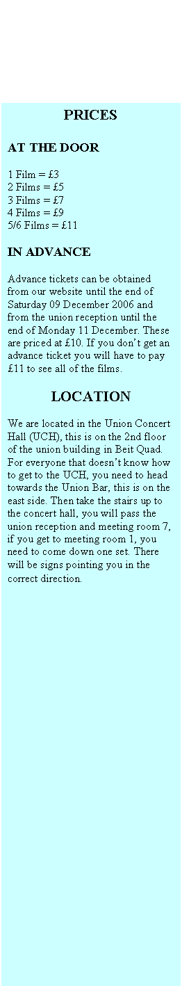 iCU Cinema Weekly Newsletter 11th December 2006 - 15th December 2006 http://www.union.ic.ac.uk/cinema cinema@ic.ac.uk Our biggest event is back where only the toughest will pass. The Christmas All-Nighter 2006: Tuesday 12 December 2006 6:00 PM - HOODWINKED! (U) The True Story of Red Riding Hood Directors: Cory Edwards, Todd Edwards Starring: Anne Hathaway, Glenn Close, James Belushi, Xzibit, Chazz Palminteri. Score: 6.7/10 80 minutes Little Red Riding Hood: A classic story, but there's more to every tale than meets the eye. Chief Grizzly and Detective Bill Stork investigate a domestic disturbance at Granny's cottage, involving a karate-kicking Red Riding Hood, a sarcastic wolf and an oafish Woodsman. Trailer <http://www.apple.com/trailers/weinstein/hoodwinked/> 7:50 PM - CLERKS II (15) No Experience Necessary Director: Kevin Smith. Starring: Brian O'Halloran, Jeff Anderson, Kevin Smith, Jason Mewes, Rosario Dawson. Score: 7.9/10 97 minutes When the Quick Stop where he has worked for a decade burns down, Dante (O'Halloran) finds new employment at bovine-themed fast food joint Mooby's, along with his old buddy-cum-bugbear Randal (Anderson). A year on, he's only 24 hours away from a whole new life. Trailer <http://www.apple.com/trailers/weinstein/clerks2/> 9:45 PM - THE DEPARTED (18) Lies. Betrayal. Sacrifice. How far will you take it? Director: Martin Scorsese Starring: Leonardo DiCaprio, Matt Damon, Mark Wahlberg, Jack Nicholson, Ray Winstone, Alec Baldwin, Gerard McSorley. Score: 8.4/10 151 minutes The Boston police department manages to place young cadet Billy Costigan (DiCaprio) deep undercover in the city's Irish-American gangland, run by the violent Frank Costello (Nicholson). But gangster Colin Sullivan (Matt Damon) has also signed on to join the police force, planning to leak information back to Costello. Trailer <http://www.apple.com/trailers/wb/thedeparted/> 12:30 AM - CRANK (18) Poison in his veins. Vengeance in his heart. Director: Mark Neveldine. Starring: Jason Statham, Amy Smart, Efren Ramirez, Dwight Yoakam. Score: 7.0/10 88 minutes A player in the Los Angeles underworld, Chev Chelios (Statham) has made some dangerous enemies. Waking up one morning, he discovers that he's been injected with a fatal poison and must keep his heart pounding fast if he's to make it through the day. Cue a carnage-causing race through LA to confront the people responsible... Some of the ways he keeps his heart pounding are very entertaining! Trailer <http://www.apple.com/trailers/lions_gate/crank/> 02:10 AM - CHILDREN OF MEN (15) No children. No future. No hope. Director: Alfonso Cuaron. Starring: Clive Owen, Julianne Moore, Chiwetel Ejiofor, Sir Michael Caine, Claire-Hope Ashity, Charlie Hunnam. Score: 7.9/10 109 minutes In 2027, the world is on the brink of collapse because no children have been born for 18 years. Offered £5,000 by a politically radical ex-girlfriend, London office worker Theo (Owen) agrees to escort a refugee to safety, but soon finds his life is in danger from both government and revolutionaries... Trailer <http://www.apple.com/trailers/universal/childrenofmen/> 04:15 AM - LITTLE MISS SUNSHINE (15) Where's Olive? Directors: Jonathan Dayton Valerie Faris. Starring: Brian Steve Carell, Toni Collette, Greg Kinnear. Score: 8.1/10 101 minutes The highly stressed Hoover clan are taken aback by seven year-old ugly duckling Olive's (Breslin) determination to compete in a beauty pageant. Circumstances force them cross country in a beaten-up VW van to be united by absurdity, disappointment and loss in one weird bonding experience. Trailer <http://www.apple.com/trailers/fox_searchlight/littlemisssunshine/> We know you love Facebook. If you haven't done so already, please sign up to the iCU Cinema group at x for the latest news and maybe some special offers! Love movies? We're looking for staff! Whether you'd like to help with projection or administration, we're looking for people to help in all areas. As a staff member you are entitled free admission to all screenings, free movie posters and half price sweets! If you're interested in helping out, please see a member of staff after a showing. We look forward to meeting you! To unsubscribe visit http://mailman.ic.ac.uk/mailman/listinfo/cinema-list <http://mailman.ic.ac.uk/mailman/listinfo/cinema-list>