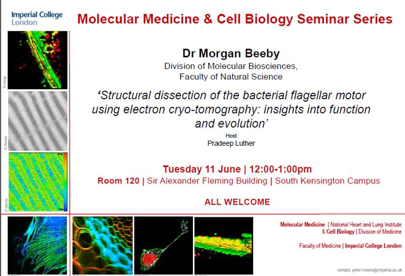 ...forwarded for your information Martin Molecular Medicine & Cell Biology Seminar Series Molecular Medicine | National Heart and Lung Institute & Cell Biology | Division of Medicine Faculty of Medicine | Imperial College London Dr Morgan Beeby Division of Molecular Biosciences, Faculty of Natural Science 'Structural dissection of the bacterial flagellar motor using electron cryo-tomography: insights into function and evolution' Host Pradeep Luther Tuesday 11 June | 12:00-1:00pm Room 120 | Sir Alexander Fleming Building | South Kensington Campus ALL WELCOME -------- Original Message -------- Subject: Molecular Medicine & Cell Biology Seminar Series | Tuesday 11 June 2013 | 12:00-13:00 | Room 120, SAF [no event today, 04 June 2013] Date: Tue, 4 Jun 2013 10:35:24 +0100 From: Enright, Catherine E <c.enright@imperial.ac.uk>