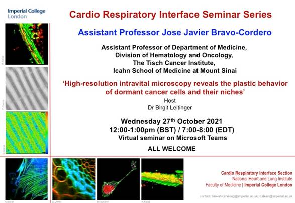 Dear all, The upcoming Cardio Respiratory Interface (CRI) external seminar will feature a talk from Assistant Professor Jose Javier Bravo-Cordero on 'High-resolution intravital microscopy reveals the plastic behaviour of dormant cancer cells and their niches' on Wednesday 27th October 2021 (12:00 - 1:00 pm). Please click on the link below for the Teams Meeting link and to find out more details about the talk: https://www.imperial.ac.uk/events/140110/high-resolution-intravital-microsco... [cid:image001.png@01D7BB7D.D2425E70] If any PIs or fellows would like to talk to the speaker individually after his talk, could you please contact Dr Sek-Shir Cheong (sek-shir.cheong@imperial.ac.uk<mailto:sek-shir.cheong@imperial.ac.uk>) by the end of this Friday, 8 October 2021. Thanks everyone. Best wishes, Sek-Shir