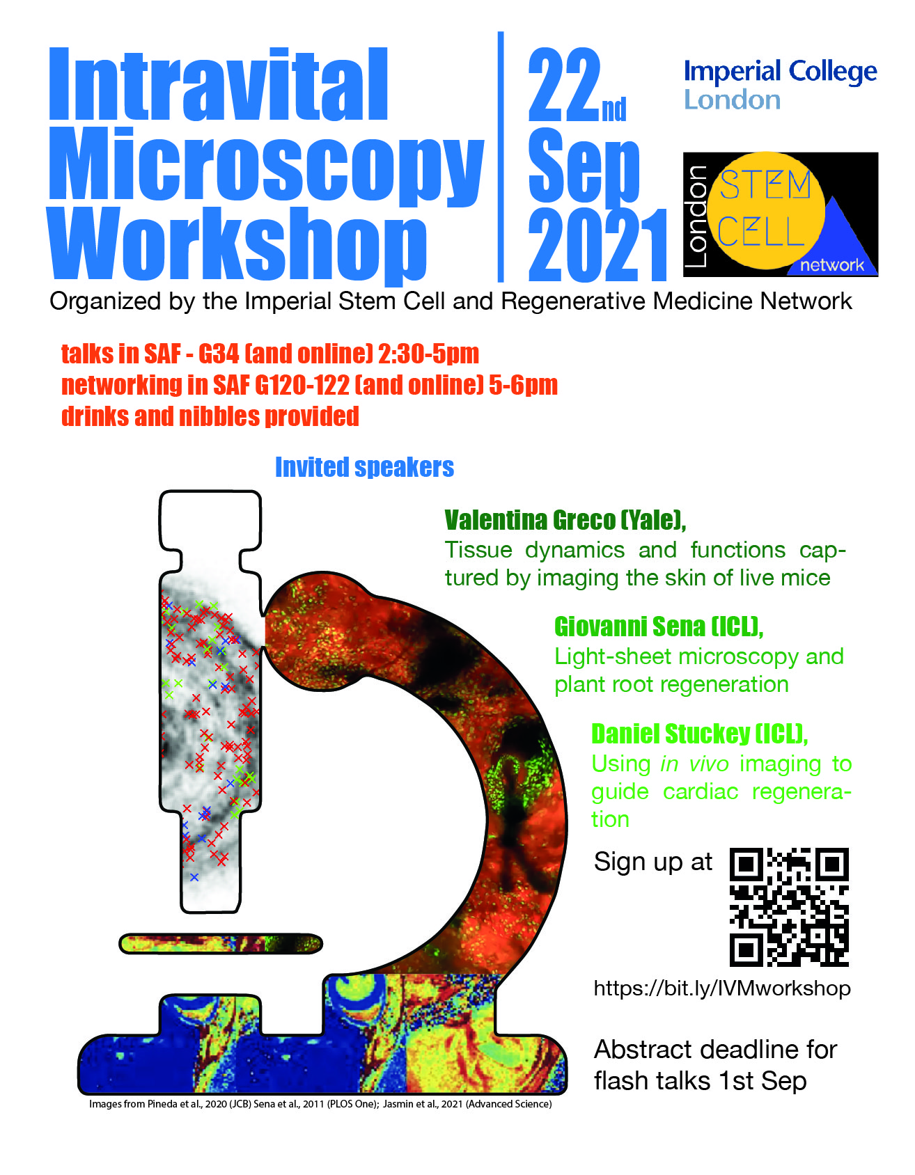 PLEASE DO NOT REPLY TO THIS E-MAIL, THANK-YOU Dear colleagues, ISRMN is organizing a Intravital Microscopy Workshop, bringing together researchers from Imperial and abroad in a series of talks and flash talks and networking. This workshop will be a great opportunity for early career researchers to present their work and interact with experts from a variety of fields. There will be prizes for the best flash talks to be used towards conference registration fees. Date: 22nd September 2021, 2.30-6pm Location: * South Kensington campus, Sir Alexander Fleming Building, G34 Lecture Theatre * Online session will also be available ABSTRACT SUBMISSION: * Abstracts should not be longer than 250 words. * Abstract should be sent to isrmncontact@imperial.ac.uk<mailto:isrmncontact@imperial.ac.uk> in PDF format. * Deadline for abstract submission: 1st September 2021 * Announcement of the selected abstracts: 8th September 2021 * Prizes of 150£ for the best flash talks to be used towards conference registration fees. PRELIMINARY PROGRAM Talks (2.30-5pm): * Professor Valentina Greco, Yale School of Medicine - "Tissue dynamics and functions captured by imaging the skin of live mice" * Dr Giovanni Sena, Imperial College London - "Light-sheet microscopy and plant root regeneration" * Dr Daniel Stuckey, University College of London - "Using in vivo imaging to guide cardiac regeneration" * Selected flash talks Networking Session (5-6pm): Drinks and nibbles will be provided Free Registration: https://www.imperial.ac.uk/stem-cell-regenerative-medicine-network/about/bia... [http://www.imperial.ac.uk/T4Assets/favicon-196x196.png]<https://www.imperial.ac.uk/stem-cell-regenerative-medicine-network/about/biannual-meetings/22-september-2021-intravital-microscopy-workshop/> 22 September 2021 Intravital Microscopy Workshop<https://www.imperial.ac.uk/stem-cell-regenerative-medicine-network/about/biannual-meetings/22-september-2021-intravital-microscopy-workshop/> Registration and abstract submission are now open! Please fill the registration form bellow! www.imperial.ac.uk<http://www.imperial.ac.uk>   Best regards, The ISRMN Coordination Team