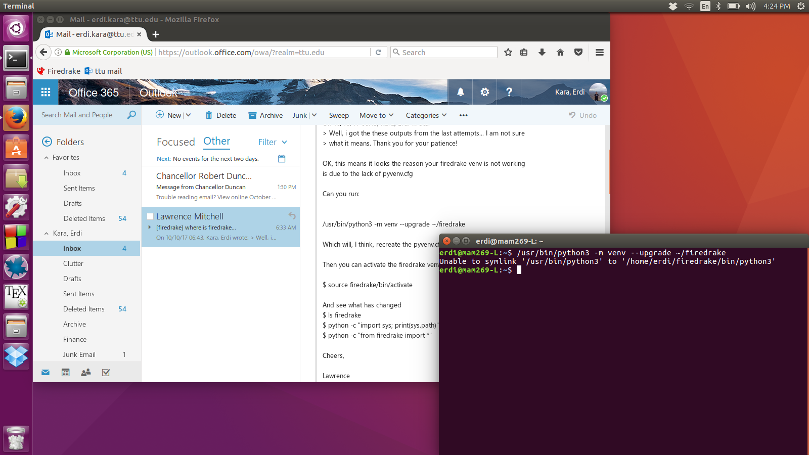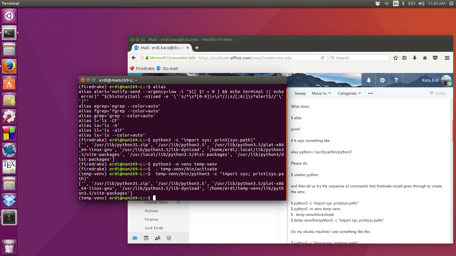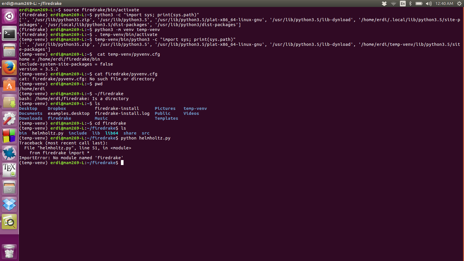 OK, so this is good, because it looks like venv creation works. The next step is to figure out what went wrong. I think I have an idea. In the temp-venv that you made, you should have a file pyvenv.cfg. What does: $ cat temp-venv/pyvenv.cfg Say? Similarly, you should have such a file in the firedrake directory. What does: $ cat firedrake/pyvenv.cfg Say? I think this might be the problem (in your first screenshot you had): $ pwd ~/firedrake $ ls bin helmholtz.py include lib lib64 share src But seemingly no pyvenv.cfg Cheers, Lawrence