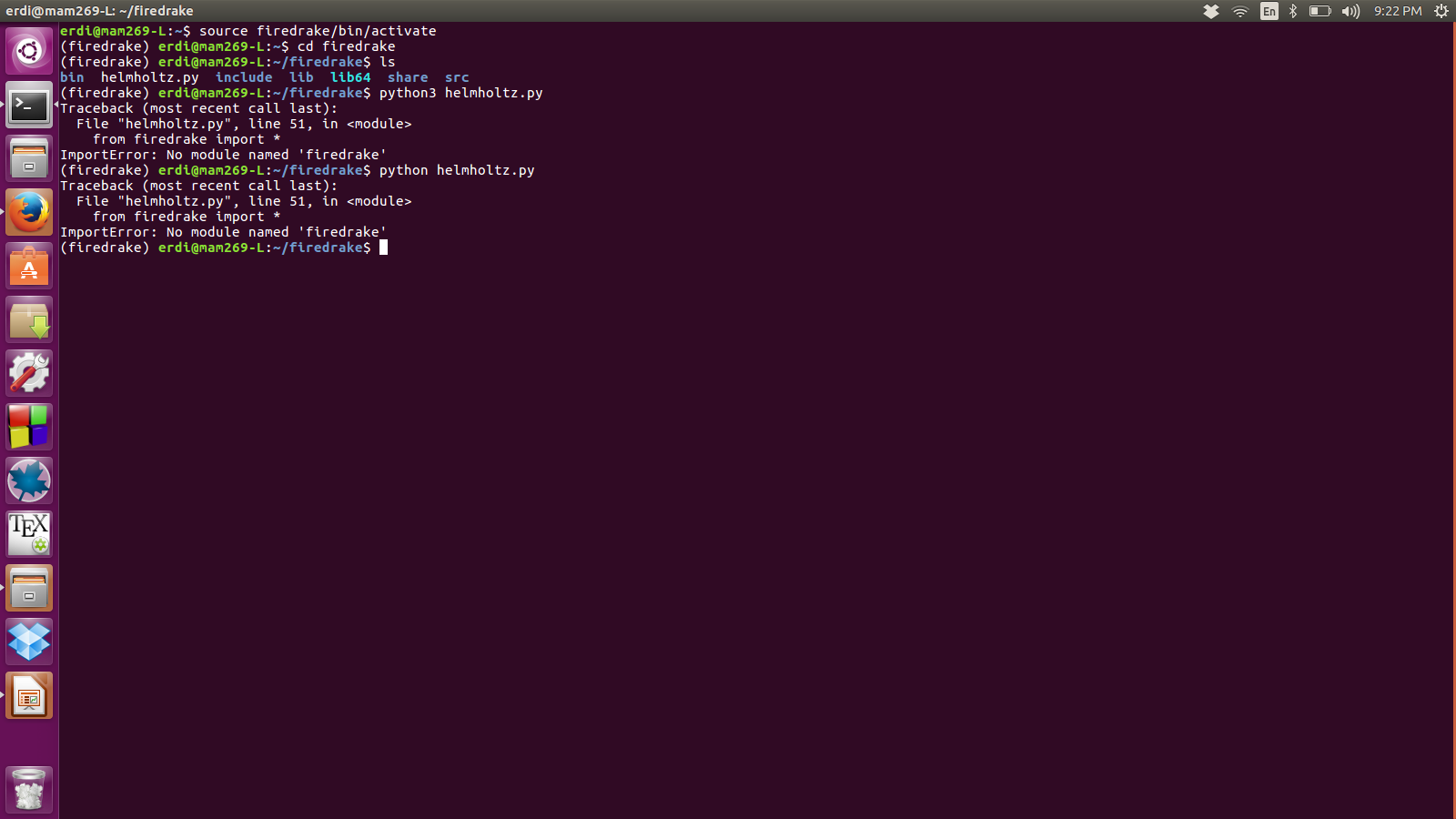 I think i already did that but no progress at all. I activated firedrake then I copied the first example -Helmholtz- and saved as python file and try to run it via terminal. I attached the screen shot. Could you tell me where I am making mistake.? I am a new user.