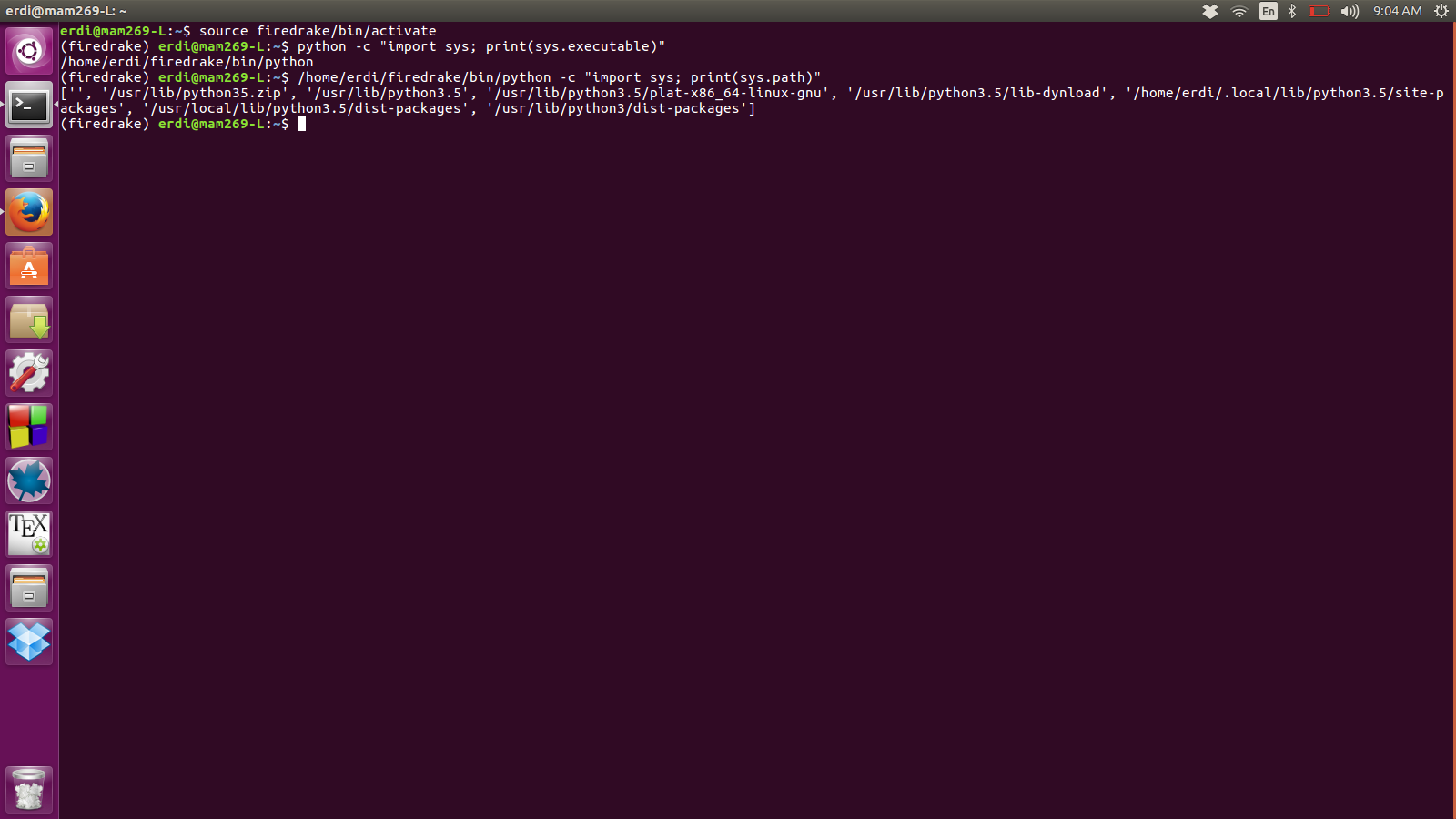 It doesn't look like you're making a mistake! A few things: 1. Can you provide the file firedrake-install.log (which should live in the directory you ran firedrake-install from, it looks like ~/ from your screenshot). 2. After activating the venv (as you did), what is the output of these commands (don't type the dollar sign)? $ which python $ python -c "import sys; print(sys.path)" Thanks, Lawrence _______________________________________________ firedrake mailing list firedrake@imperial.ac.uk https://mailman.ic.ac.uk/mailman/listinfo/firedrake _______________________________________________ firedrake mailing list firedrake@imperial.ac.uk https://mailman.ic.ac.uk/mailman/listinfo/firedrake _______________________________________________ firedrake mailing list firedrake@imperial.ac.uk https://mailman.ic.ac.uk/mailman/listinfo/firedrake
