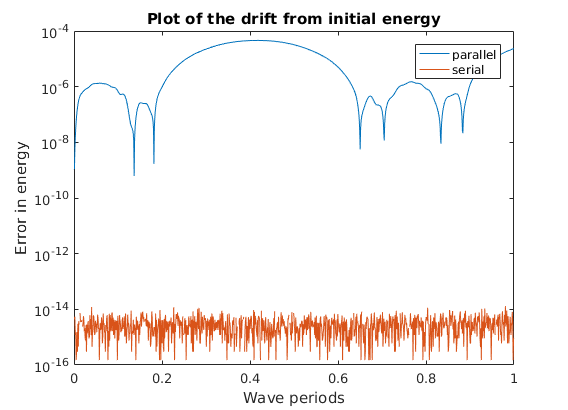 Dear Firedrakers, Attached is a code for a skew symmetric FEM scheme, that should conserve the discrete energy of the system. I have two issues: 1) When I run the code in serial, it conserves energy as expected but when I run it in parallel there seems to be an error. Attached a graph of energy drifts from running on 1/2 cores. 2) To make the code skew symmetric, I have to project physical variables ( density, velocity) into their variational derivatives. Currently this is done by extending the system from (vel, dens) to (vel, dens, vel_deriv, den_deriv) and I include the projection as part of the mixed system. Obviously this is rather expensive as I double the amount of variables used, and I'm looking to use this for more complicated systems. I believe Colin mentioned to Onno, there may be a better way of including this projection step without extending the mixed system. Thanks Will