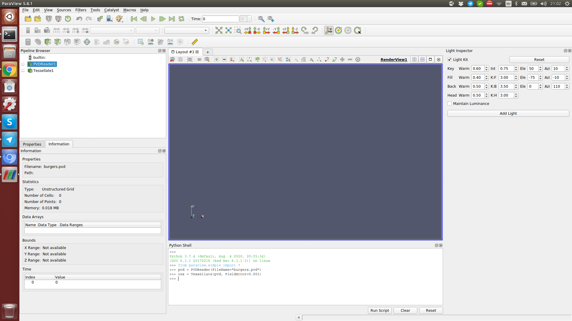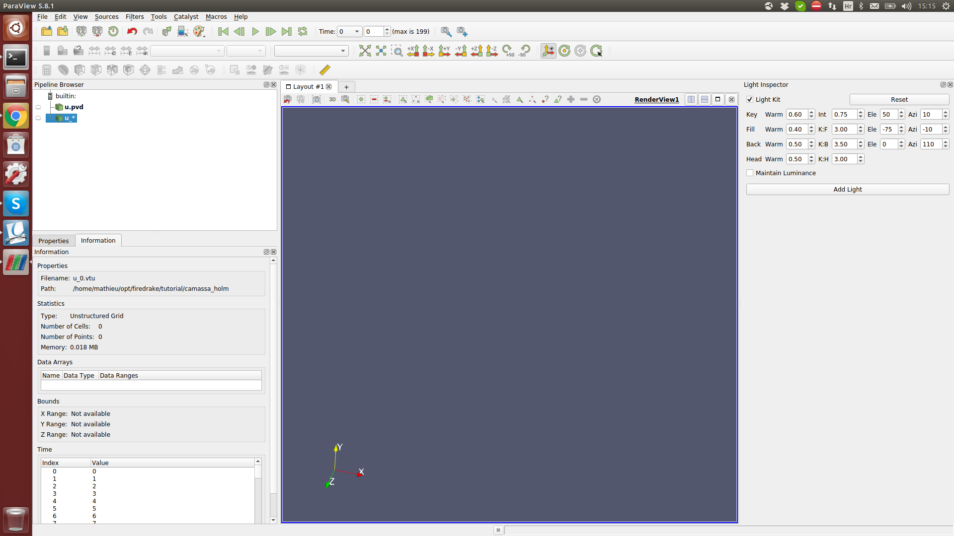 Dear all, I know it is more a paraview question than firedrake, but the question is about how to visualize the data using paraview. The documentation on the firedrake website is quite succinct and does not tell anything about the User Interface of Paraview, which is fine. But I do not know how to get pictures and I wonder where the error lies. If I run some example, like say, Camassa-Holm I obtain a sequence of .vtu files. When opening with paraview 5.8.1 the files u.pvd or u_0.pvd I obtain the image in attachment. The image points out to several errors: "Number of cells: 0" "Number of points: 0" "X range: not available" "Y range: not available" "Z range: not available" So clearly some grid is missing somewhere but I do not know how to provide it. Would it be possible to provide some basic information on how to use paraview on the vtu files? Alternatively, since Paraview is scriptable, I would very much appreciate having a python script for creating output from paraview (such as the double-slit youtube video) in one of the tutorial test cases. Thank you very much in advance for any help, Mathieu
