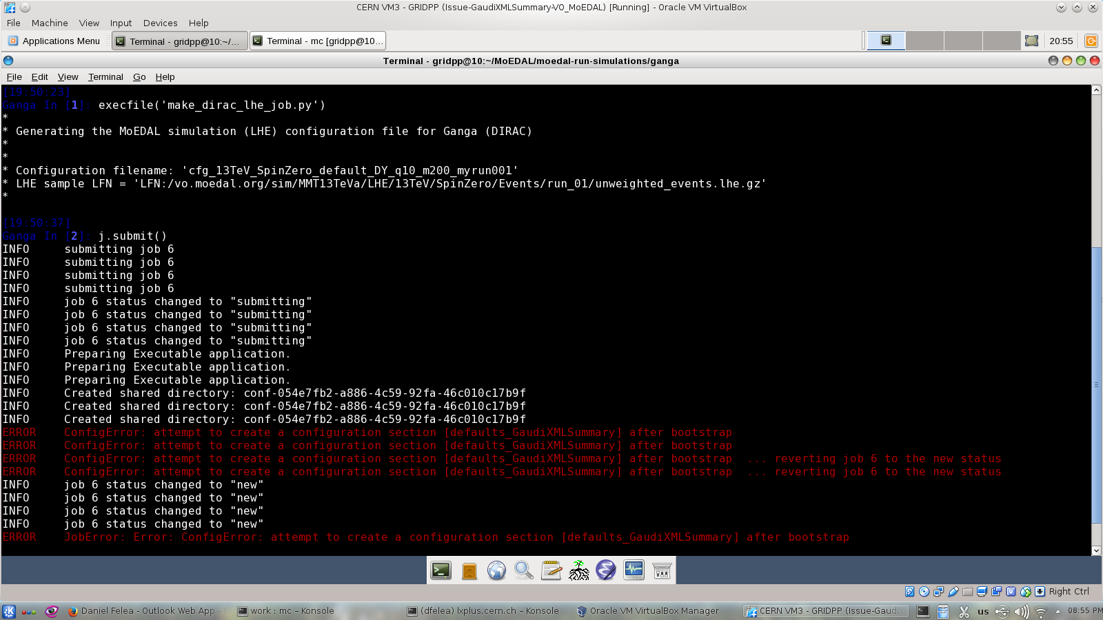 I have got a recent issue when submitting MoEDAL simulations on Grid using Ganga and Dirac. Please see the png file attached, regarding the ConfigError (something with defaults_GaudiXMLSummary). The .gangarc file I have been using is the default one, adapted to VO MoEDAL. And everything goes perfectly when running lxplus or local simulations using Ganga on VM...