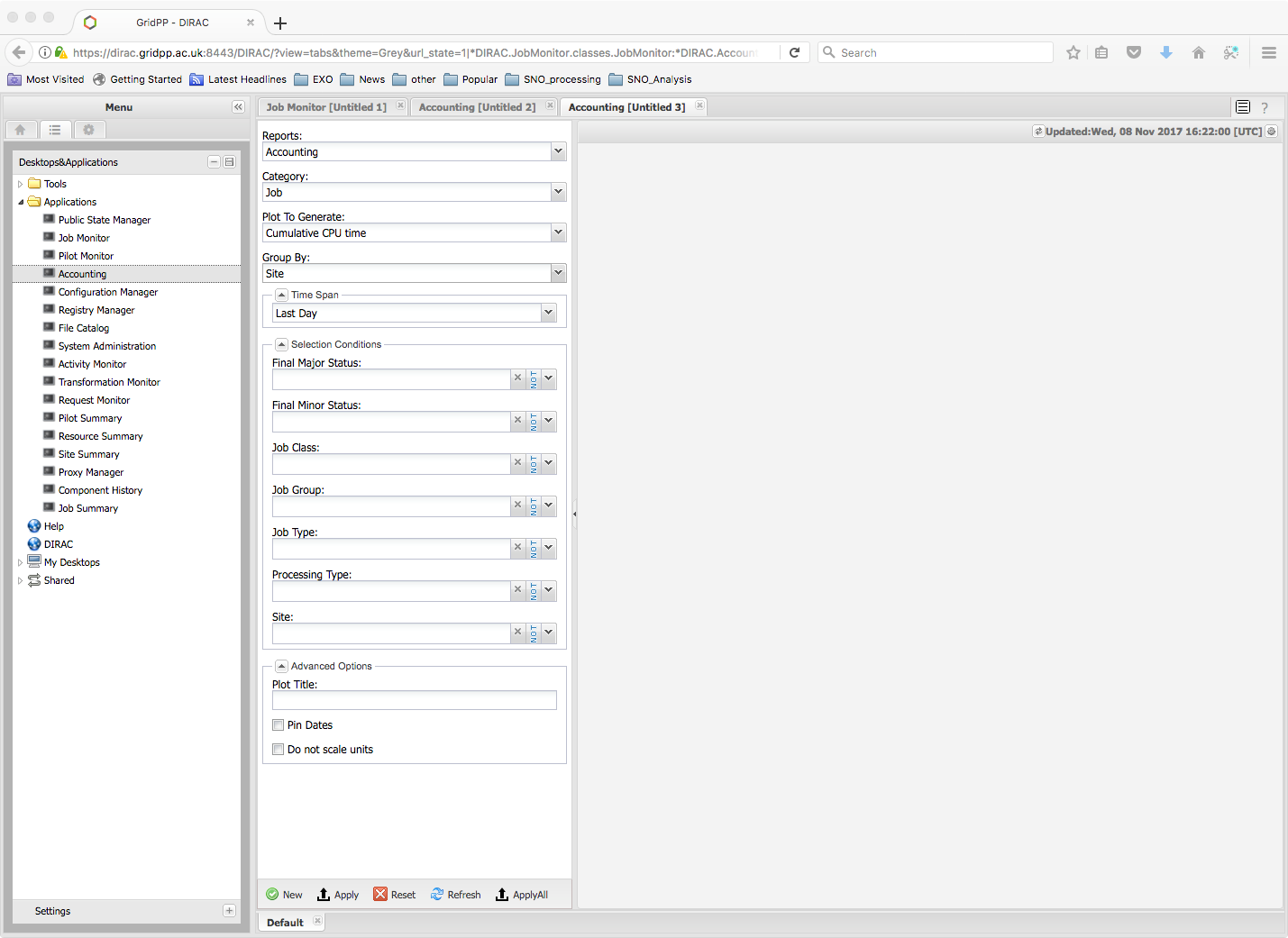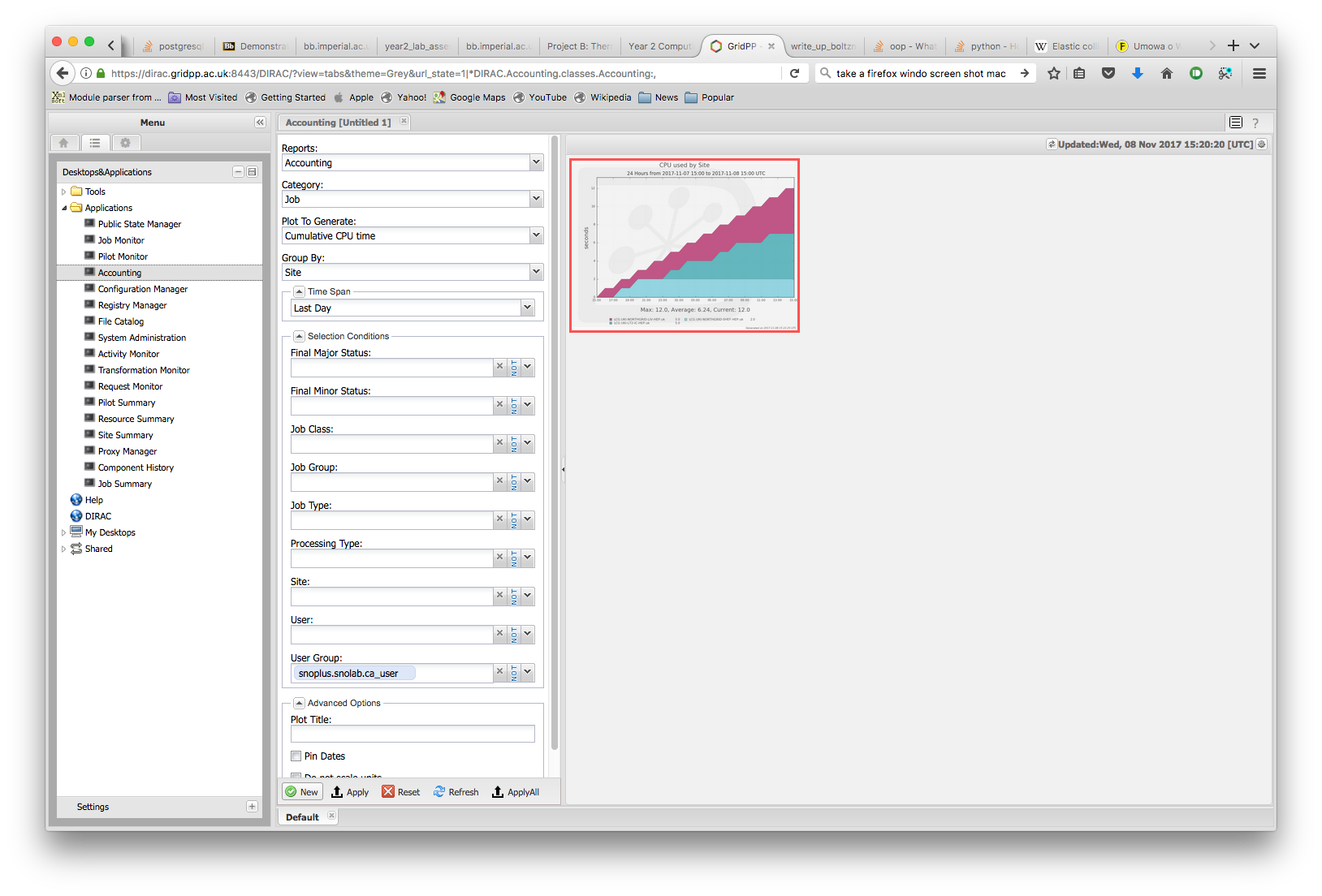 Hi David, I obtained a plot for CPU by site for a gridpp_user group: !) select accounting, 2) Then select options from the drop-down menus: Reports: Accounting Category : Job Plot to generate: Cumulative CPU time Group by: Site Time span: Last day <other left black up to:> User Group: gridpp_user Then press the green ‘new’ button. A lovely multicolour plot appears for the whole gridpp_user group. (I have never submitted that many jobs myself .. . ;-) ) I’m acting as a gridpp_user member, no Dirac admin rights. Let me know if it works for you. thanks, JM