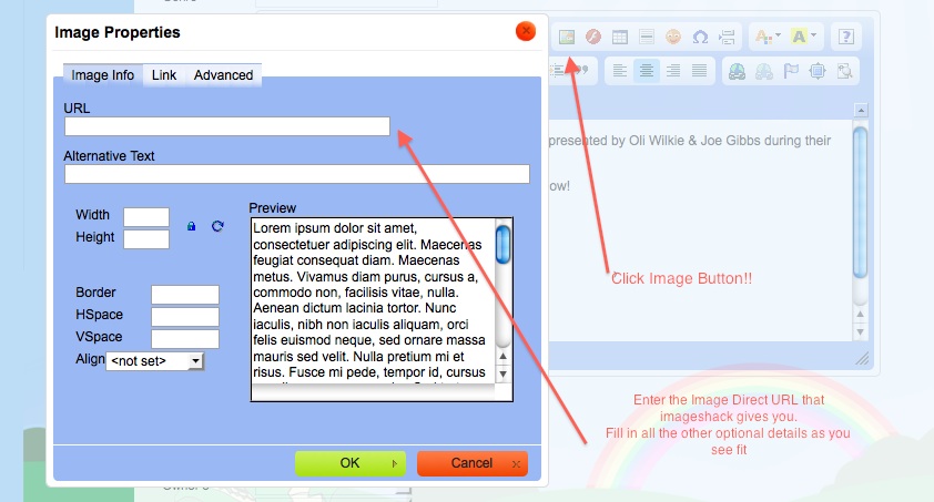 Apologies if image is too small to read. This attachment should be better. [cid:8AD4C27F-038A-408B-862E-73C5BB412907] On 11 Nov 2010, at 17:53, Wilkie, Oliver wrote: Adding images to your show page is encouraged! Unfortunately we do not provide image hosting at this time so you need to make use of an image hosting website. I recommend that you use imageshack.us<http://imageshack.us/> to store all your images. Its really quick and painless. To add image and text to your show you need to use the show homepage editor module located in the navigation menu of your members area. Attached is a screenshot demonstrating what to do once you are on the show homepage editor module. <image_guide.jpeg> Any questions please feel free to ask. Cheers, Oli Head of Tech @ ICRadio.com<http://ICRadio.com/> technical@icradio.com<mailto:technical@icradio.com> PS. Good luck to ICRadio at tonight's SRA Awards!! On 10 Nov 2010, at 17:27, Palmer, Lewis wrote: Hi, I'm the presenter of "The Sunshine Hour". Would it be possible for you to add the attached photo to our space on the website? Cheers Lewis _______________________________________________ ICRadio-Announce mailing list ICRadio-Announce@imperial.ac.uk<mailto:ICRadio-Announce@imperial.ac.uk> https://mailman.ic.ac.uk/mailman/listinfo/icradio-announce