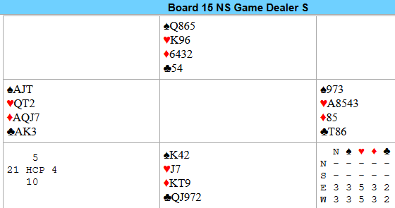 Hello Everyone There is no session in May 20. However, we still have weekly questions. W----N----E----S ------1D---/-----1S /-----2D---/-----2H /-----3D---/-----3NT // Lead = C2 (4th) S: A9 H: Q10 D: QJ87453 C: QJ6 S: KJ1052 H: A52 D: A10 C: 1083 The opponents will let you win the first round. Please try your best to make this contract. ########################################### The answer to last week's question is now given below: 13rd May Weekly Question (From Portland Bowl Final) W----N----E----S 2NT--/---3D*---/ 3H---/---3NT---/ 4H--// Notice that 3D is a transfer just like you bid 2D to 1NT opening. Thus 3NT is the pass-or-correct S: 973 H: A8543 D: 85 C: 1086 S: AJ10 H: Q102 D: AQJ7 C: AK3 Lead = C5, try to make this contract and please take great care of your entries. Suggested route is to win with the CA (remember you can try C8 at the first trick, but we assume the C9 is in the right hand). Then we have to assume we only lose 1H otherwise this contract will be too difficult to play. The HA should be reserved for drawing the trumps, since the generally acceptable play for this suit combination is H2 to HA and then H3 to H10. Thus, we assume the H is 23 break and the remaining 2 trumps must be used to ruff the minor, since we need the two entries for double finesses in Spade. In all, the Diamond finesse must be given up, and should be played immediately because we are likely to lose the trick on the second round, risking the club losers to be revealed. My answer to this deal is: CA -> DA -> DQ (lost to DK) -> CA (Assume opponents continued the C) -> HA -> H10 (lost to HK) -> Double finesses on Spade [cid:44635a97-f20f-4af1-95cd-cf52c7548a87] Thank you Vice President Tianxiang Fu (Jacky)