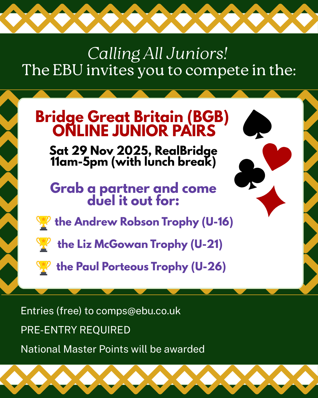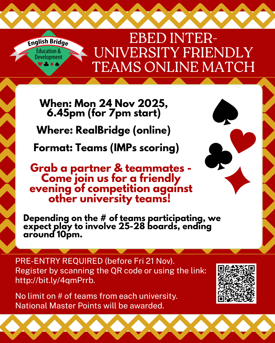 Dear all, Our weekly sessions take place every Tuesday 6-8pm in Blackett 630. IC Bridge Club won't be sending out weekly emails to spam your inboxes, and we will only use emails to communicate room changes and other news. We will also send out some bridge exercises from time to time. You can join our WhatsApp group chat if you haven't already. Link: https://chat.whatsapp.com/L1bALix5TTC7HAPxqEacn8 Now, here is some news from EBU: 1. Portland Bowl The well-known inter-university teams-of-four knock-out competition, which starts each autumn and runs through to a semi-final and final hosted by the Portland Club in London in the spring. Early matches are zoned to minimise travel. Last date for entries is Mon 10 Nov. To register, see https://www.ebu.co.uk/competitions/portland-bowl 2. EBED Inter-Uni Online Teams Friendly, 24 Nov Mon (6.45-10pm) A brand-new match that EBED is organising this year in response to your requests for more opportunities to play with (and against) other fellow uni students. It's all online, and it's free! Masterpoints will be awarded. See attached flyer and please register here<http://bit.ly/4qmPrrb> by 21 Nov Fri. [Realbridge Inter-Uni Friendly (24 Nov).png] 3. BGB Online Junior Pairs, 29 Nov Sat (11am-5pm) In contrast to the first two, this competition is Pairs/MP scoring, and there are three category prizes up for grabs: U-16, U-21, U26. This is also online and free, with participation not just from within England but also from other GB countries (Wales, Scotland, Northern Ireland) + Ireland. Pre-entry required (see attached flyer and please register via emailing 'comps@ebu.co.uk<mailto:comps@ebu.co.uk>'). National masterpoints will be awarded. [BGB Online Junior Pairs.png] Please let me know if you want to take part in Portland Bowl or EBED online match. We are also planning an in-house competition near the end of term (UCL students might join as well), more details to follow. Regards, Kevin (President)