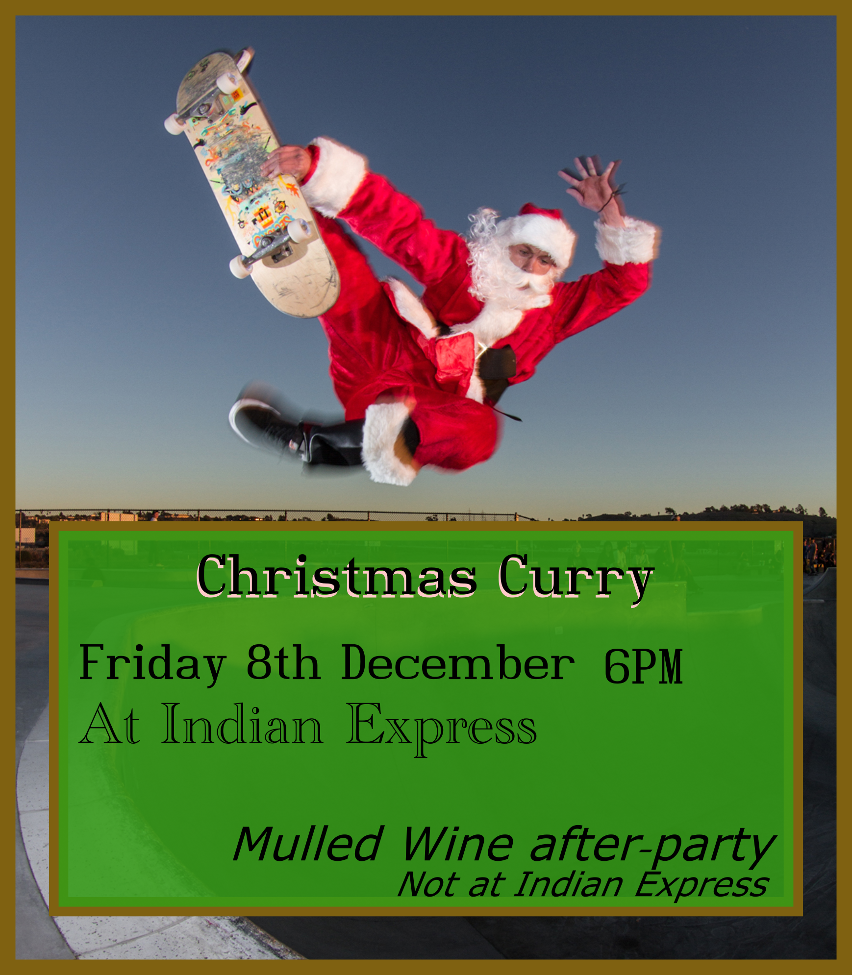******************* This email originates from outside Imperial. Do not click on links and attachments unless you recognise the sender. If you trust the sender, add them to your safe senders list https://spam.ic.ac.uk/SpamConsole/Senders.aspx to disable email stamping for this address. ******************* Hello Merry Cavers, This year's annual Christmas Curry is right around the corner! We will be indulging in the finest of curries at the Indian Express <https://maps.app.goo.gl/oJ2jRwTx2XBLio986> Friday 8th December 6pm to 8pm Reply to this email if you want to go (*you want to go*) Feeling FESTIVE? Afterwards, we'll be having mulled wine (oh yeeah <https://www.youtube.com/watch?v=6jJkdRaa04g>) [image: christmas curry.png] Wear gloves when you cycle, Leo -- Imperial College Caving Club <https://imperialcaving.com/>
