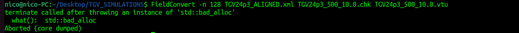 Dear All, i'm trying to use the FieldConvert utility with the option "-n" to specify the number of points for equispaced interpolation in each direction. I have attached in the pic below what happens if i try the command (i receive a bad_alloc error).