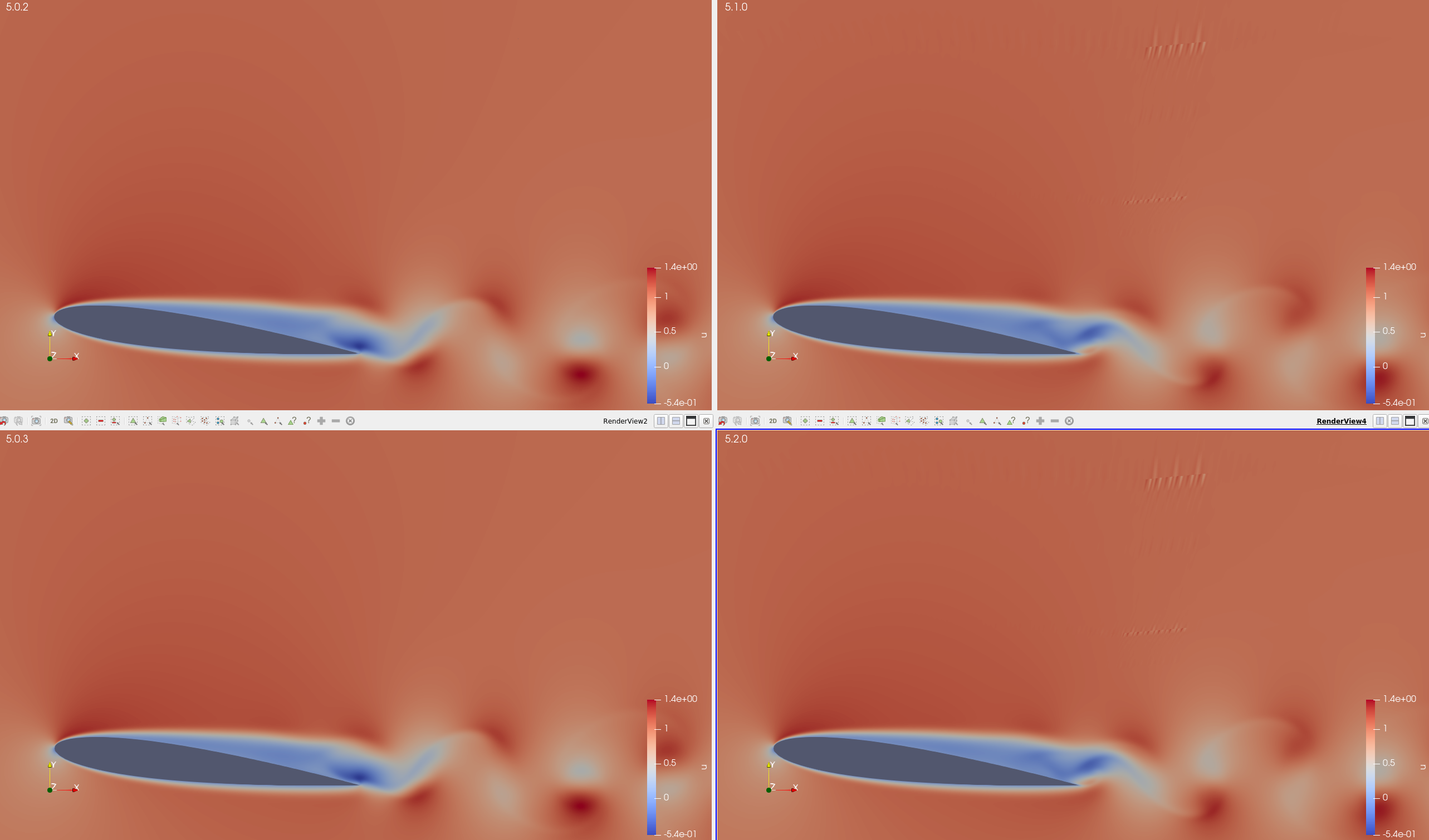 I want to solve the incompressible flow around the naca0012 with nektar++. I have attached the input file that I am using for such a case. For nektar++ versions v5.1.0, v5.2.0 and 5.3.0 (master) some spurious results, two checkerboard patterns, around half and one chord length right above the trailing edge show up. Such a checkerboard pattern does not appear when using nektar++ v5.0.1 and v5.0.2. I have enclosed a screenshot showing the comparison between the different versions.