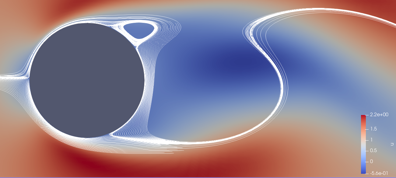 ******************* This email originates from outside Imperial. Do not click on links and attachments unless you recognise the sender. If you trust the sender, add them to your safe senders list https://spam.ic.ac.uk/SpamConsole/Senders.aspx to disable email stamping for this address. ******************* Hello, I have solved the flow around a 2D cylinder using the IncNavierStokesSolver. Attached, you will find an image of the flow field (flowfield.png). As you can observe, there is a recirculation bubble on the upper rear of the cylinder, along with a separation point at the lower rear. I am looking to plot the wall shear stress as: sign(wss_x) * wss_mag. I’ve extracted the data using FieldConvert into a .csv file, which is also attached. I have a couple of questions regarding the postprocessing: 1) At the aft (0.5, 0), there’s an abrupt sign change in wss_x, which is not continuous. I believe this is related to how wall normals are defined in Nektar. To correct this, it seems necessary to multiply the wss_x values for the lower surface by -1. I am not sure about the (0.5, 0) itself. Is there a way to account for this sign change during postprocessing in Nektar? Or would it be possible to apply a preprocessing step in Nekmesh? 2) The simulation was performed with NUMMODES="2" and TYPE="MODIFIED." The edges of each element are duplicated in the .csv file, but the values for these duplicated points are noticeably different (e.g., (-0.4998656761, 0.01158903919) – entries 4 and 5). I suspect this is again related to the normal definitions, as the norm_y values differ significantly. Is there a way to smooth this out, perhaps with a pre- or postprocessing technique? Also, please note that the region between x = -4.35778714e-02 and 4.35778714e-02 on the upper and lower surfaces does not correspond to the cylinder, which explains the gap in the .csv file. Thank you in advance for your help. I look forward to your suggestions. Cheers, Guillermo