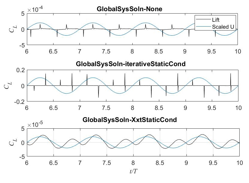 Same issue has been observed in the scenario of oscillatory flow (U=Um*sin(2*pi/T*t)) past a fixed cylinder at small KC=Um*T/D values, say, KC < 2, where the flow is symmetric along the streamwise direction. The attached figure shows an example of the time histories of lift coefficients (black lines) using different Global system solution schemes. The scaled freestream velocity is plotted as blue lines for reference. The drag & inertia coefficients and the overall flow fields wouldn’t be affected among those three cases.