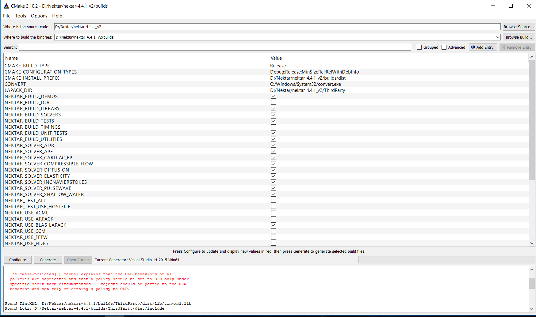 I am currently trying to install Nektar++ for Windows 10 following the instructions in user-guide-4.4.1. After completing the building/installation process (point 12.) I got 5 errors. Configuring and Generating in cmake seems successful, although some kind of error message is present (see in Message.txt). In the Output.log you can see the installation process (not my first attempt) and in pic1 and pic2 the appearance of cmake. I am using Visual Studio 2015 (x64). Should you have any questions or suggestions, please contact me. Any help is greatly appreciated!