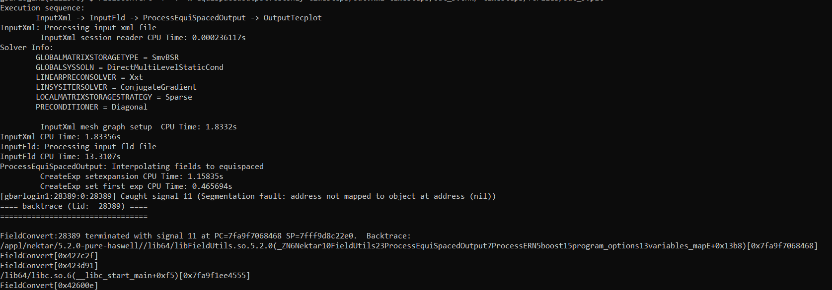 ******************* This email originates from outside Imperial. Do not click on links and attachments unless you recognise the sender. If you trust the sender, add them to your safe senders list https://spam.ic.ac.uk/SpamConsole/Senders.aspx to disable email stamping for this address. ******************* Hi, Hope everybody is having a nice summer vacation. But the simulations must go on! I am running a quasi-3D simulation. In my test case I have a tetra 2D mesh and 8 Fourier planes. So the elements are triangular prisms. As discussed in many earlier posts, use of equispacedoutput normally decreases the output file size. However, when I use equispacedoutput it not only interpolates my 2D mesh, but also creates triangles in z-direction. Thus, the final output is not comprised of triangular prisms but tetrahedrons. Although decreasing the file size of the 2D mesh, this increases the total file size, because I basically have double the amount of elements along z-direction compared to prior. With the hope to solve this problem, I tried tetonly flag. I am unsure if this is the correct option to use. I get the attached error message, when I run FieldConvert with this option: FieldConvert -f -v -m equispacedoutput:tetonly timeSteps/out.xml timeSteps/out_3.chk/ timeSteps/fcFiles/out_3.plt Here out.xml is my mesh, out_3.chk is the time step I want to convert, and out_3.plt is the name of the output. I know that FieldConvert fails specifically when I use tetonly, as it works when I don't use it. I would very much appreciate any help to solve this problem or a suggestion for a workaround. Thank you in advance for your help. With kind regards, Ilteber -- İlteber R. Özdemir