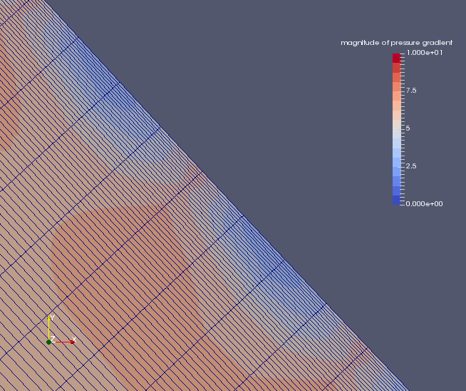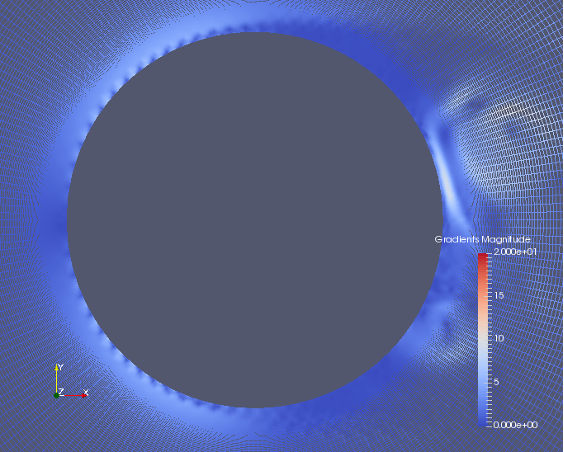 The test case used 3345 macro-elements in 2D plane (x-y plane). 70 edges are distributed on the cylinder boundary. The other direction (z direction) is solved by Fourier mode. For the purpose of test, a short spanwise length is set, like Lz=0.2. The results of instantaneous velocity field seems smooth near the boundary of circular cylinder. However, the instantaneous pressure field showed overshoot (or numerical oscillation?) between two neighboring macro-elements. I attached an example in the email. In order to manifest the overshoot, the visualization uses the magnitude of pressure gradient.