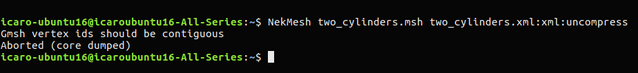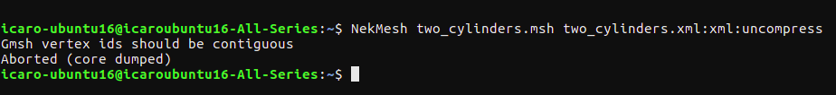 Hi all, I'm using Nektar+ 4.4.1 and have run Gmsh 4.1.3, 4.1.4 and 4.1.5. When I generate the mesh it seems to be fine on all Gmsh versions. No error output on my .msh file whatsoever. However, when I use Nekmesh to generate the .xml file the following error emerges (both for compressed and uncompressed conversion): [image: image.png] Could any one provide some input on how do I solve this? Sds, *Icaro Amorim de Carvalho*. *Master's candidate* * in Mechanical Engineering* *University of São Paulo - Escola Politécnicaamorim.icaro@usp.br <amorim.icaro@usp.br>*