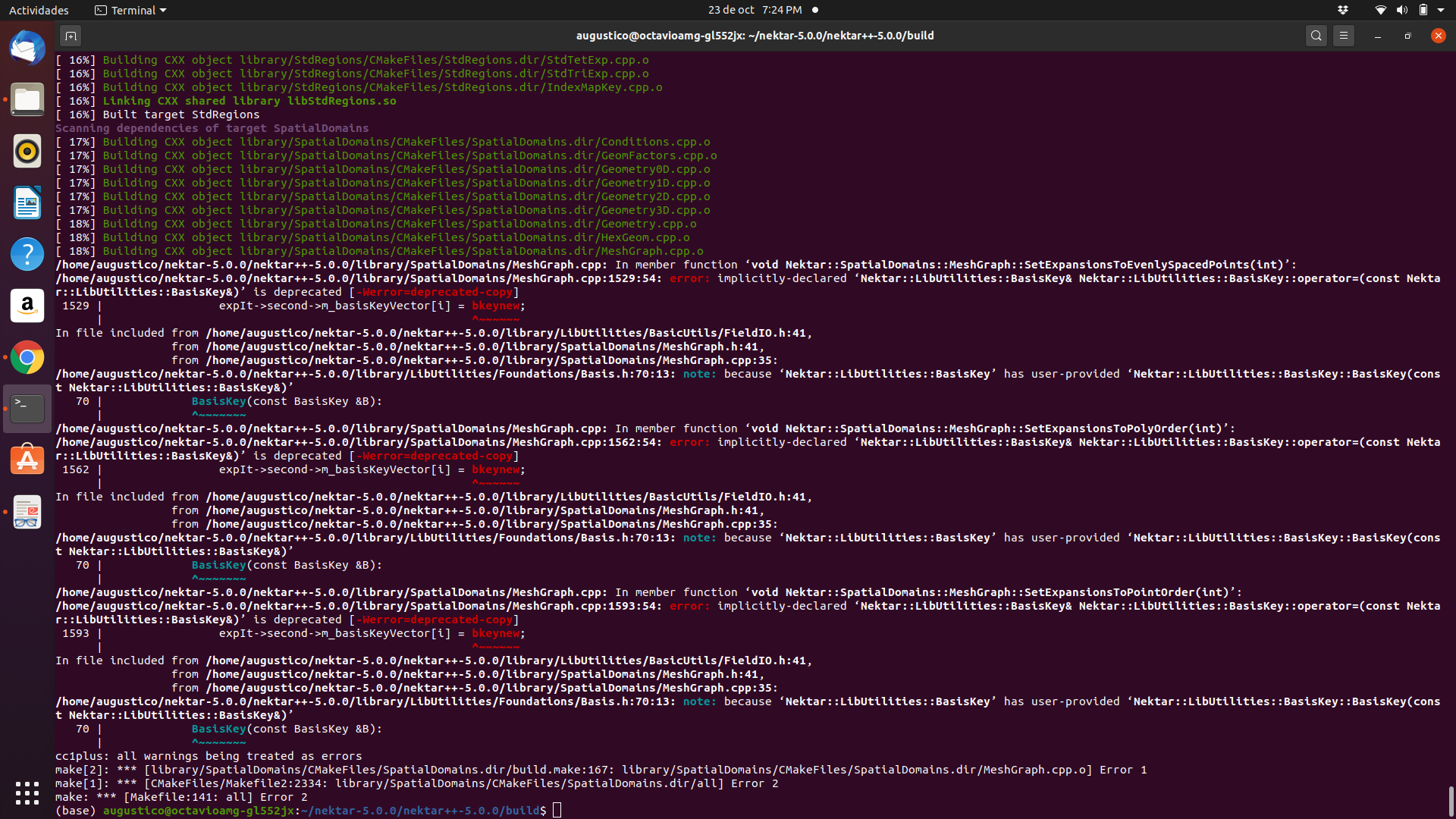 Hi Octavio, It looks like this is a result of the updated version of gcc being used in Ubuntu 20.04. This issue was highlighted by another Ubuntu 20.04 user on the mailing list a few days ago. I assume you’re using the Nektar++ 5.0.0 release, downloaded from https://www.nektar.info/downloads/ <https://www.nektar.info/downloads/>? This release was made sometime before the release of Ubuntu 20.04. The issues with building on 20.04 have been resolved in the Nektar++ GitLab repository <https://gitlab.nektar.info/nektar/nektar> and the fixes for Ubuntu 20.04 will be included in the next release. In the meantime, your options are to build the code from the latest master branch on GitLab (see the “Clone the git repository” part of section 1.3.1 in the Nektar++ manual <http://www.nektar.info/downloads/file/user-guide-pdf-4/>), or to disable the warning that is resulting in this error. I’d recommend trying to build with the latest source and letting us know if this is successful. If you encounter further problems, we’ll need a little more information to be able to provide some more concrete advice. It would be great if you could provide us with the CMake command that you’re using to run the configuration and the version of gcc/g++ on your Ubuntu 20.04 system as a start. We can then try to offer further assistance. Kind regards, Jeremy