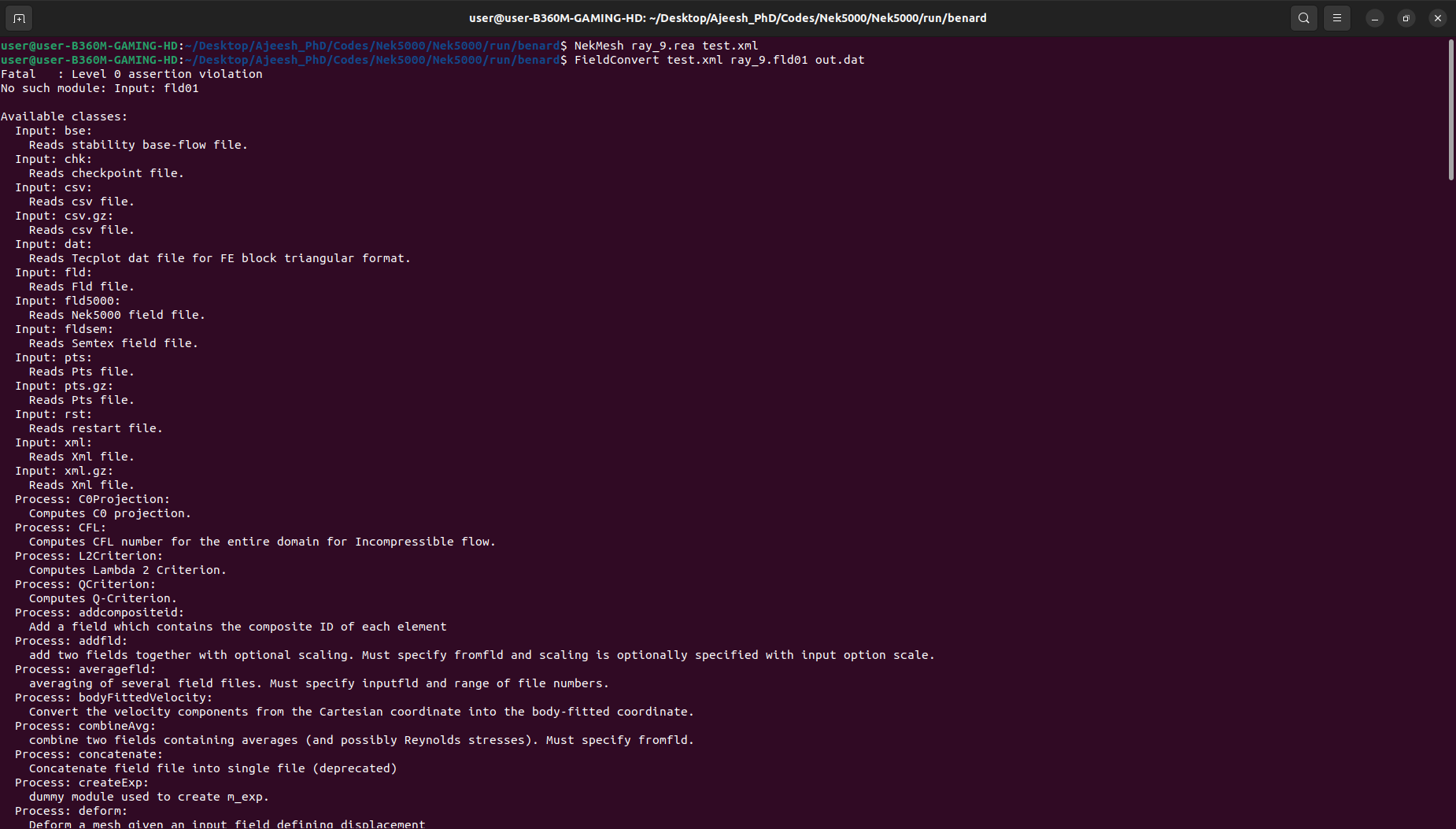 Hi Jacques, First of all, thank you very much for your quick response and willingness to help. I was trying to verify whether the FieldConvert can read the Nek5000 file using the command, FieldConvert input.fld output.fld before using the actual command you mentioned. This command is intended to convert the Nek5000 field files to nektar++ format, and hence is sufficient to verify whether the FieldConvert can handle Nek5000 formats as claimed. However, the FieldConvert fails to detect the file format as explained in my first email. Now, as you suggested, I tried the actual command to get the files in tecplot compatible format. For that, I need the mesh files in xml format. Since the NekMesh utility accepts .rea files, the following command has been executed successfully. NekMesh test.rea test.xml Then I tried to generate dat file using the command you mentioned, but it failed showing the same error message; No such module: Input: fld01 Clearly, it fails to understand the file format. And it suggests .fld5000 format to read Nek5000 field files. This file format is not used by Nek5000 and I could not find any information reagarding that online. It would be verymuch helpful if you can provide any insight about this issue. I have attached the screen shot of error message for your reference. Thank you once again for your support. *Warm regards,* *Ajeesh Mohan T,* *Doctoral Research Scholar,* *IIT Bombay, Mumbai, India.* [image: FieldConvert_test.png] On Wed, Feb 14, 2024 at 11:08 PM Jacques Xing <jacques.xing@kcl.ac.uk> wrote: