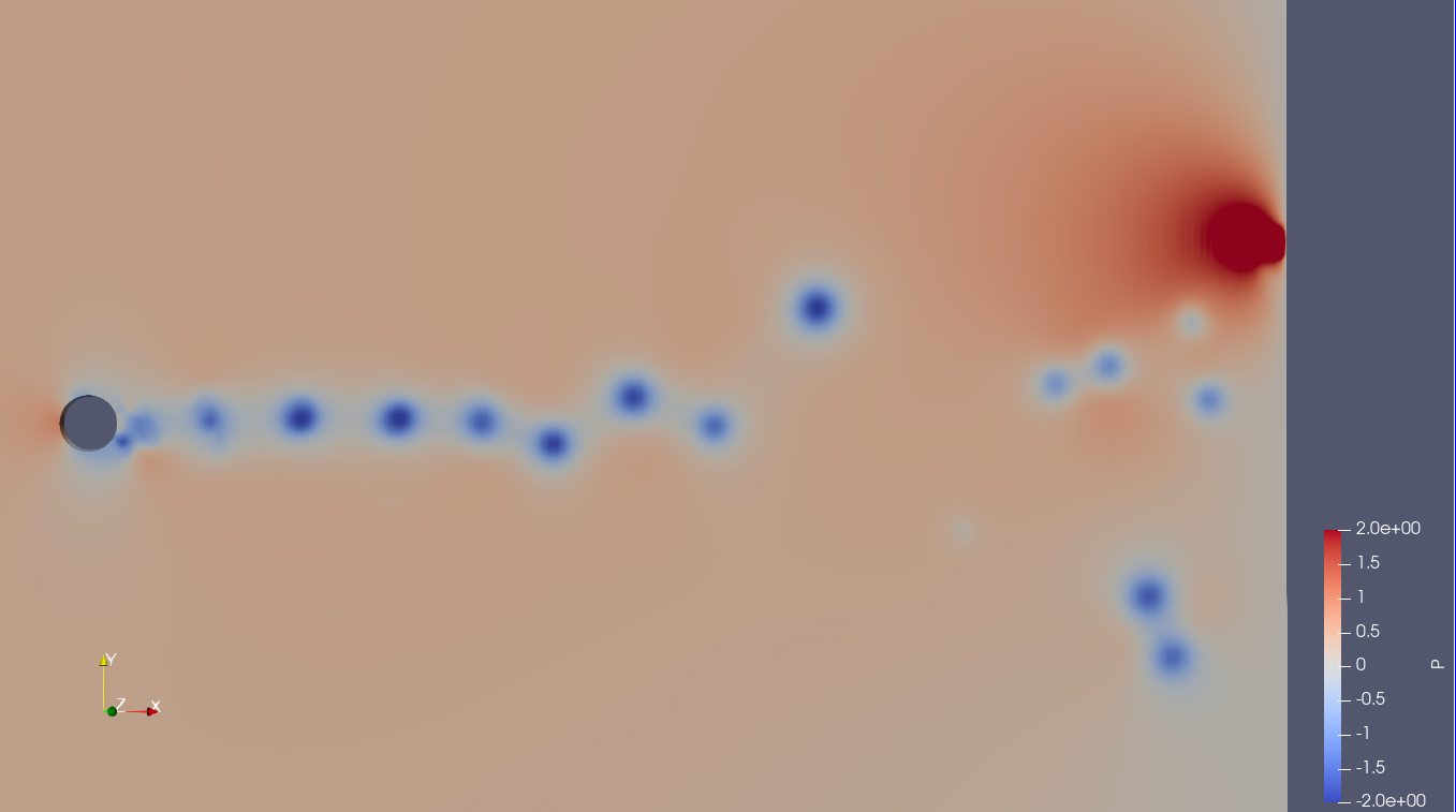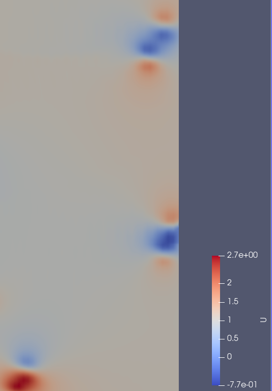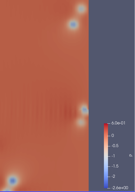 Hi Matt, What are your boundary conditions? I presume it is a zero gradient outlet condition. Are you using the higher-order outflow boundary condition, namely <REGION REF="1"> <!-- outlet !--> <N VAR="u" USERDEFINEDTYPE="HOutflow" VALUE="0" /> <N VAR="v" USERDEFINEDTYPE="HOutflow" VALUE="0" /> <D VAR="p" USERDEFINEDTYPE="HOutflow" VALUE="0" /> </REGION> This should prevent reflections from the boundary into the flow domain. Cheers, Ilteber -- İlteber R. Özdemir On Tue, 5 Sept 2023 at 13:01, Matt Duran <matt.duran60@gmail.com> wrote: