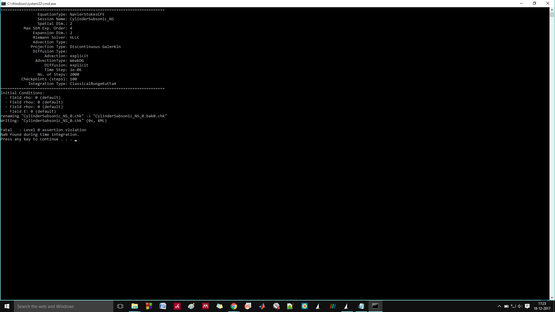 Hello, I am seeing NAN time integration error while solving a simple problem with compressible NS solver. Can anyone tell me what is probably causing it? I have attached the screenshot of the error and the xml file running the solver.